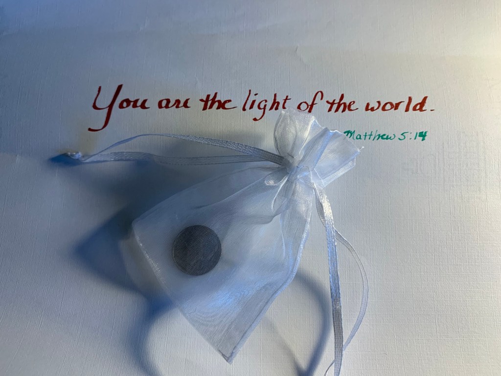 Of course, the ideal would be to live this message of Jesus, carried in a simple, ordinary, nickel, all year round. So, my hope for each of us this holy season is to hold fast to our very own nickel, held close in safe keeping by the remembrance of one of the great teachings of Jesus: You are the light of the world. (Matt 5:14). May each of us, more often, wake up each day in pure delight wondering, “What will it be today that will help me to give away my nickel…again? How may I shine a light of hope for my brother or sister struggling with some hardship unknown to me? Just how may I, dear Jesus, spread your message, humbly and anonymously, one nickel at a time?”